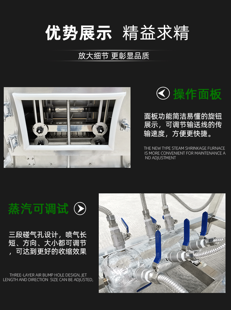 蒸汽收縮機利用蒸汽的恒溫且溫度擴散均勻的特性,能夠使收縮膜緊密地貼合在被包裝物品的表面