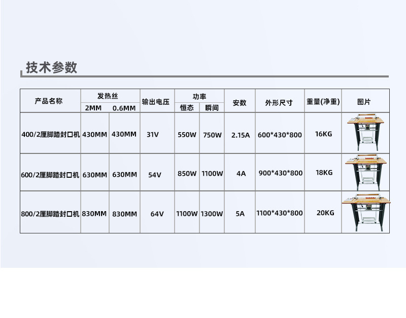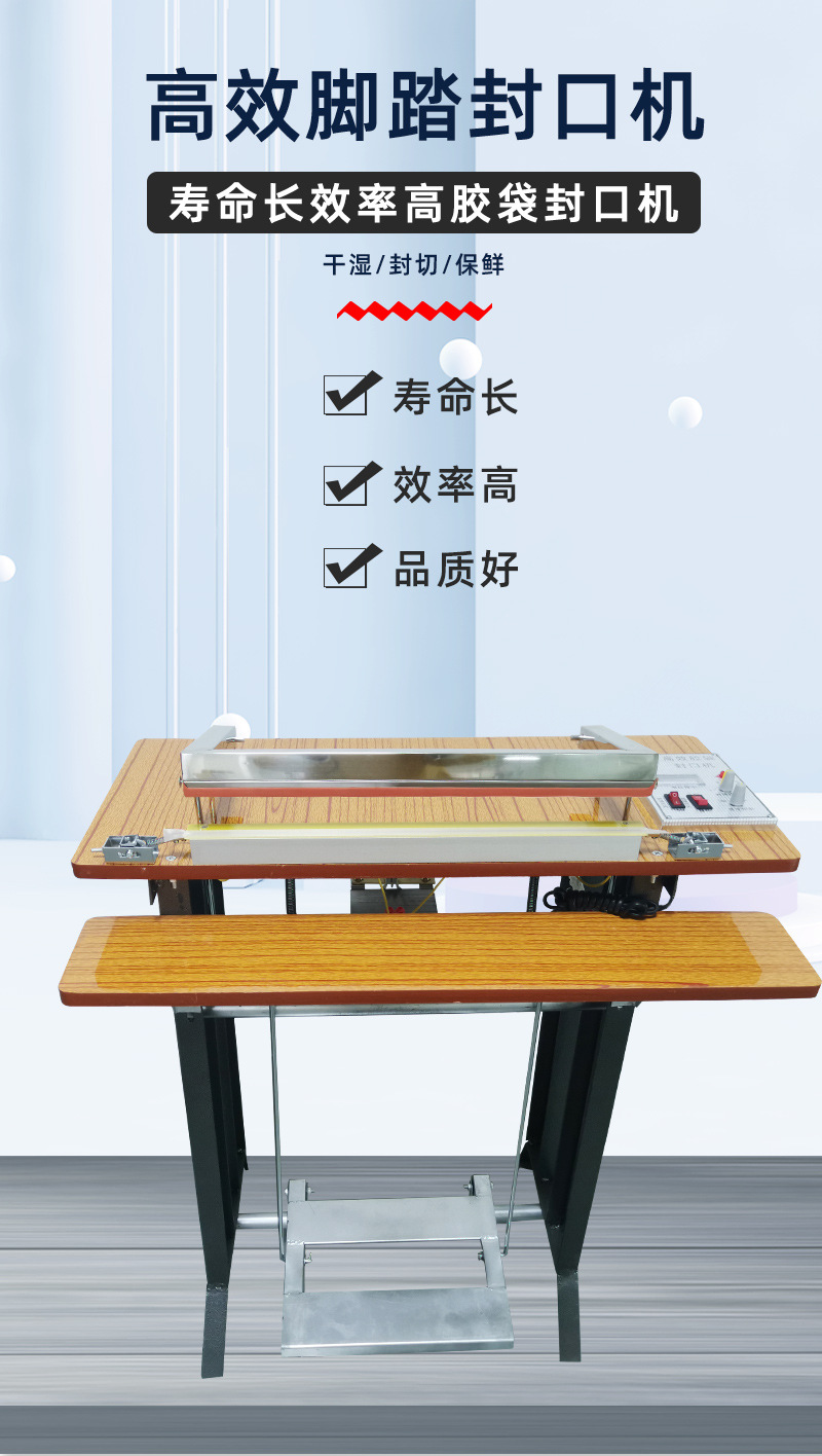 • 操作簡單方便:通過腳踏方式控制封口動作,操作直觀、容易掌握。不需要復雜的電氣控制知識,操作人員可以快速上手。這種簡單的操作方式尤其適合小型企業、商鋪或家庭作坊等對包裝設備操作要求不高的場所。