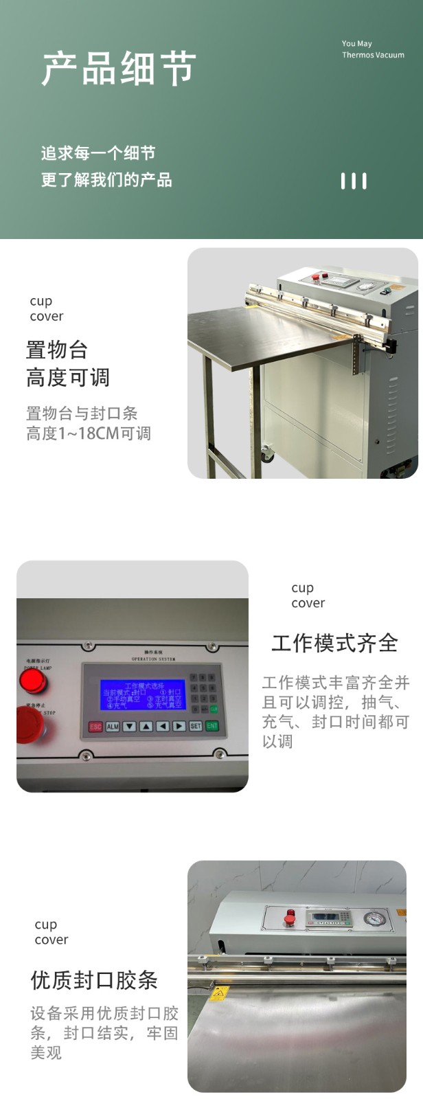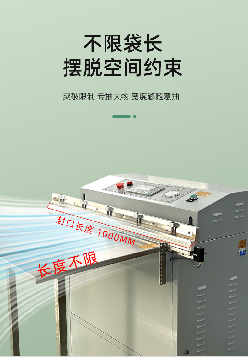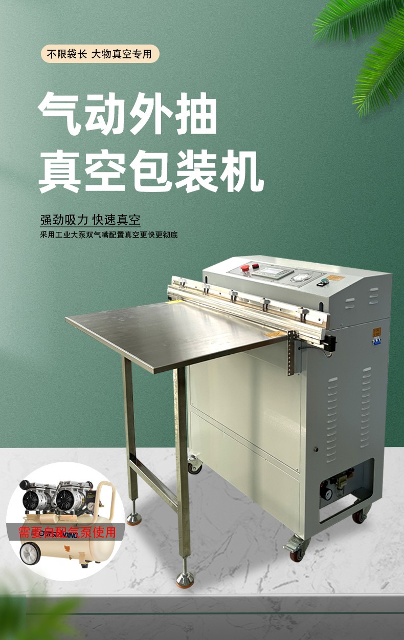 • 外抽式:一般采用立式結構,無密封真空室,由工作臺、抽氣裝置、封口裝置和控制系統等組成,結構較為簡單,占地面積小。