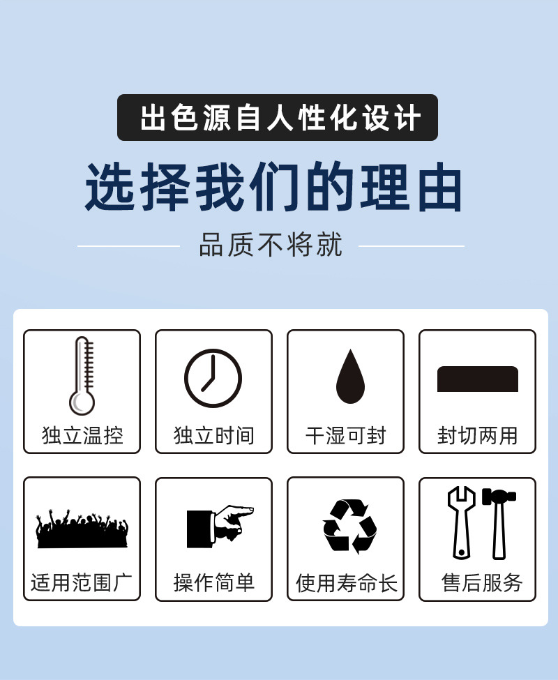 - 適用范圍廣:適用于聚乙烯、聚丙烯、多層復(fù)合塑料等多種材質(zhì)的薄膜封口,廣泛應(yīng)用于食品、醫(yī)藥、土特產(chǎn)、電器元件、工廠、商店、服務(wù)行業(yè)等14。