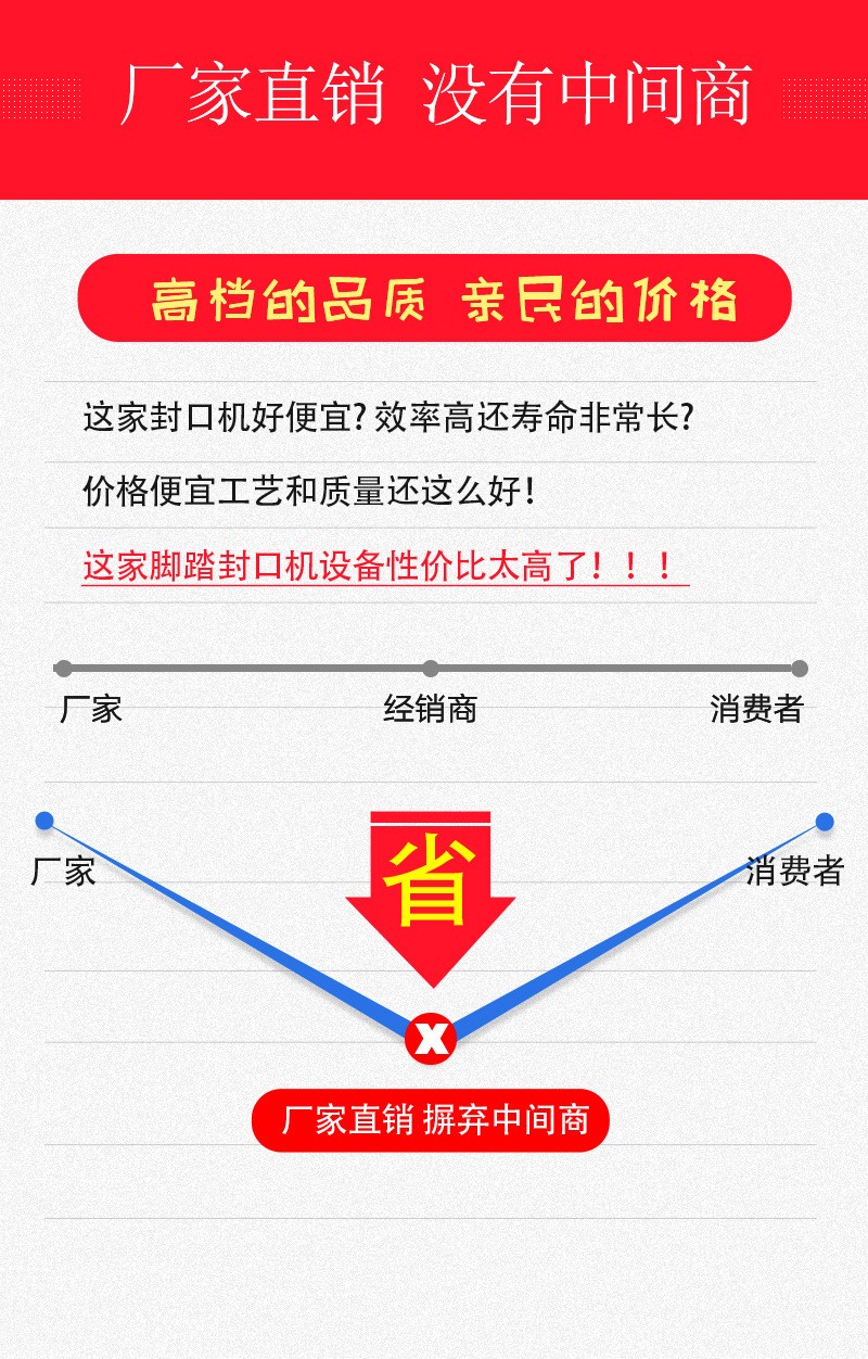 - 設(shè)備成本低:相比一些全自動(dòng)的封口設(shè)備,腳踏封口機(jī)結(jié)構(gòu)相對(duì)簡(jiǎn)單,價(jià)格較為低廉,對(duì)于小型企業(yè)、家庭作坊或預(yù)算有限的用戶來(lái)說(shuō),是一種性價(jià)比高的選擇。