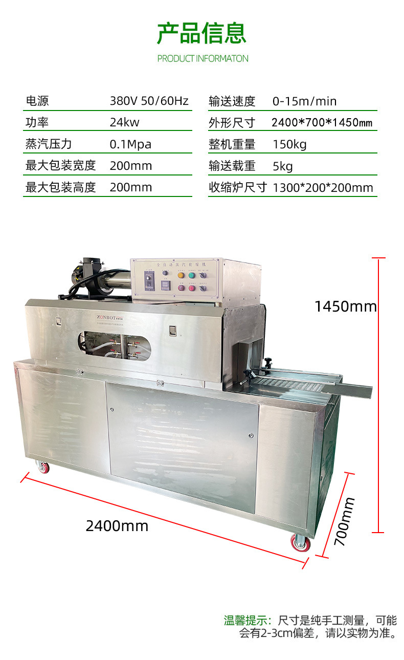 • 部分蒸汽收縮一體機(jī)配備自動(dòng)套膜裝置,能自動(dòng)將熱收縮薄膜準(zhǔn)確套在物品上,提高包裝效率。對(duì)于一些小型或簡(jiǎn)易的一體機(jī),也可通過人工進(jìn)行套膜操作。