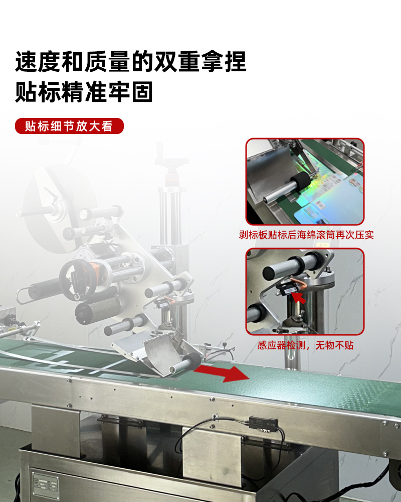 • 標簽輸送帶:負責將剝離后的標簽輸送至貼標位置,與產品輸送帶同步運行,確保標簽與產品在貼標瞬間準確對接。標簽輸送帶同樣具備精確的速度控制和位置校準功能。