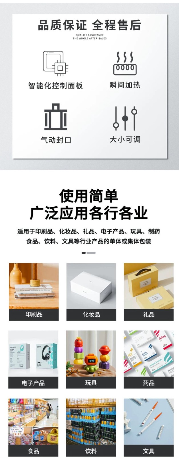 - 熱收縮:利用熱收縮膜在恒溫受熱下,分子重新緊密排列使面積縮小的特性,將套有熱收縮膜的產品通過熱收縮機的加熱通道,使膜緊附于產品外表。