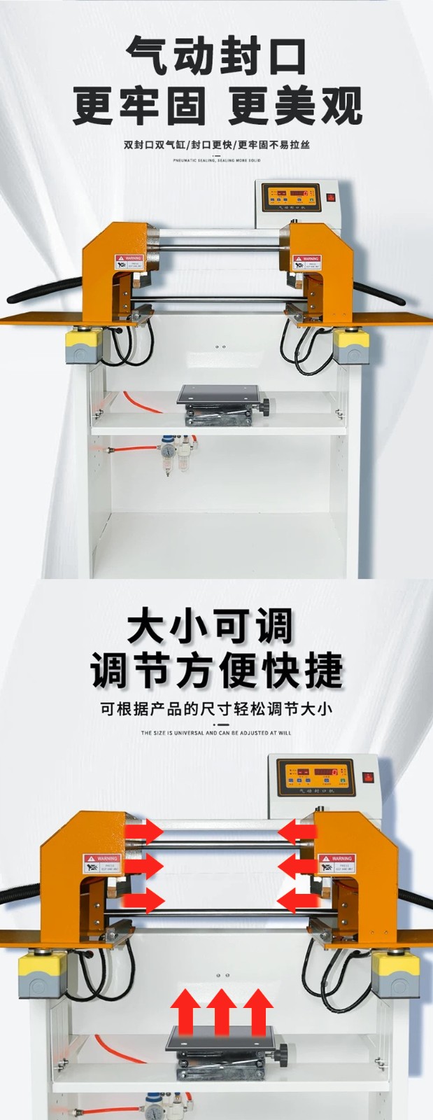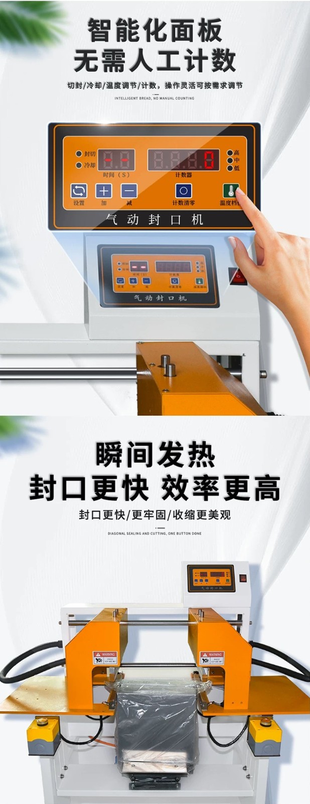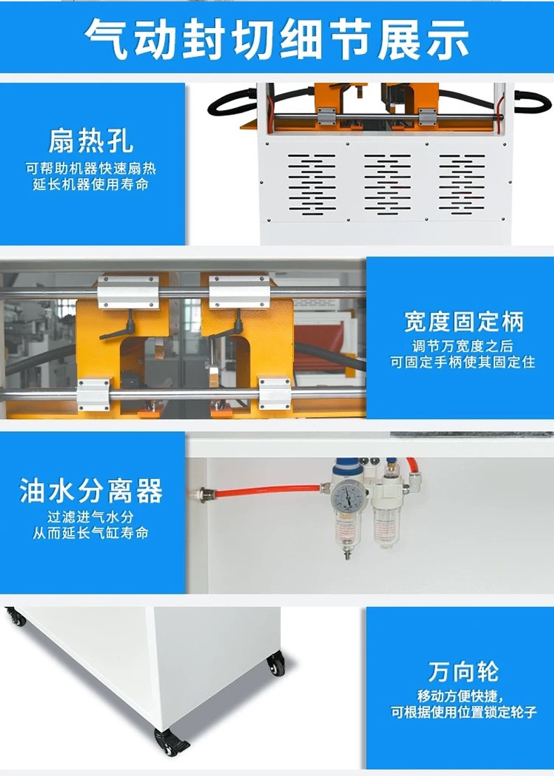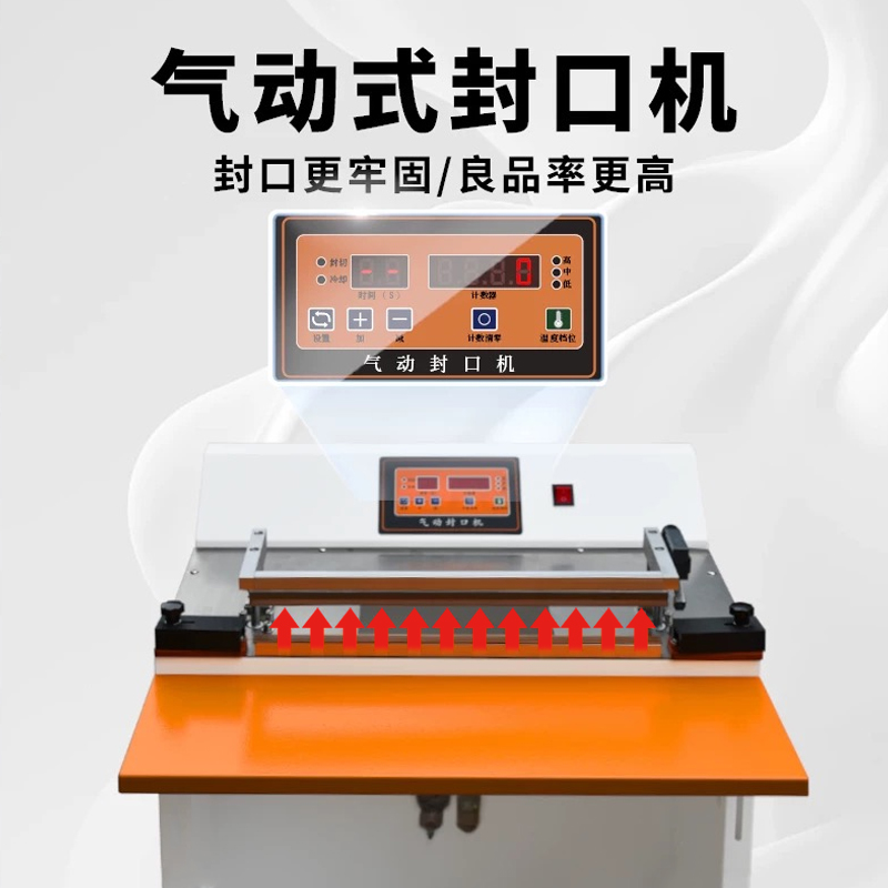 - 氣動封口:利用壓縮空氣驅動氣缸,帶動封口部件運作。電器脈沖技術使發熱元件發熱,在熱量和壓力共同作用下,實現包裝材料的封口。