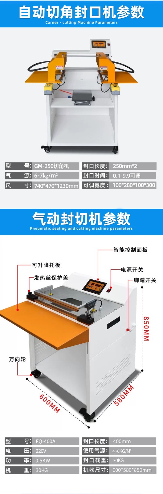 - 封口切角系統:主要包括氣動元件、發熱元件、切角刀具等,負責完成封口和切角的動作。