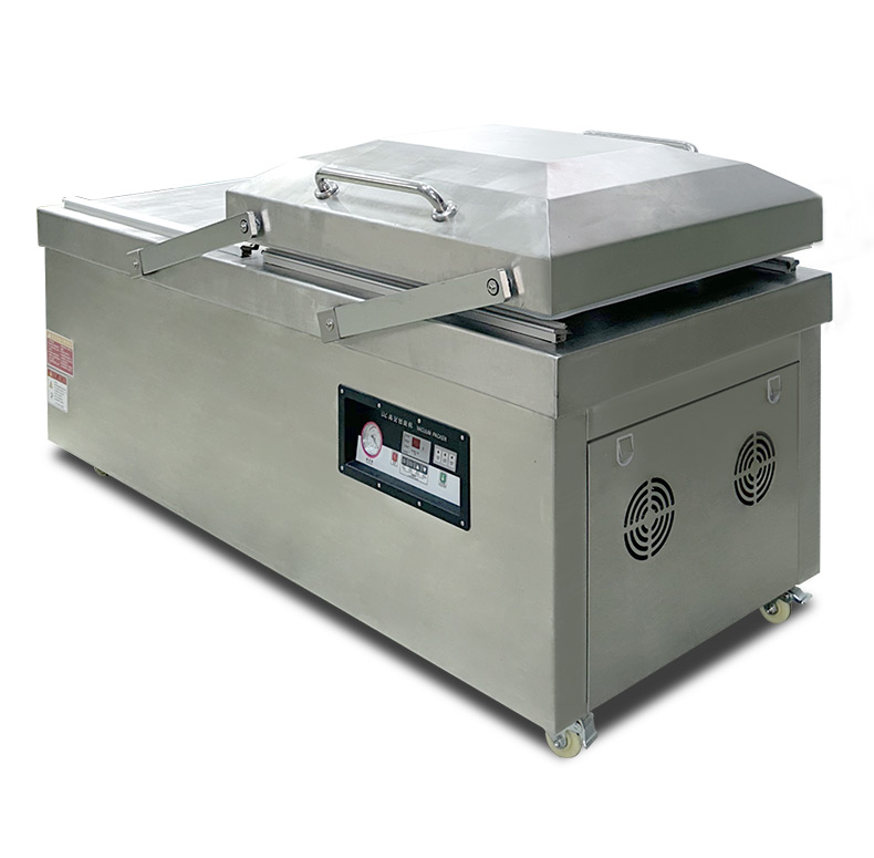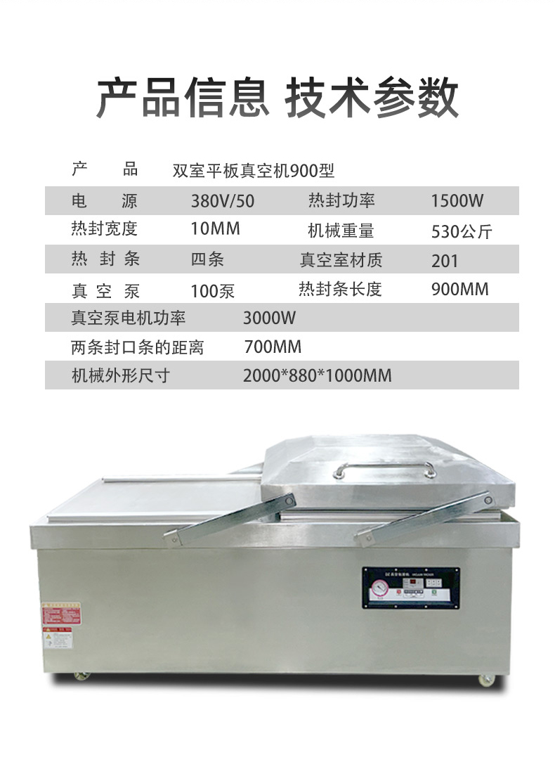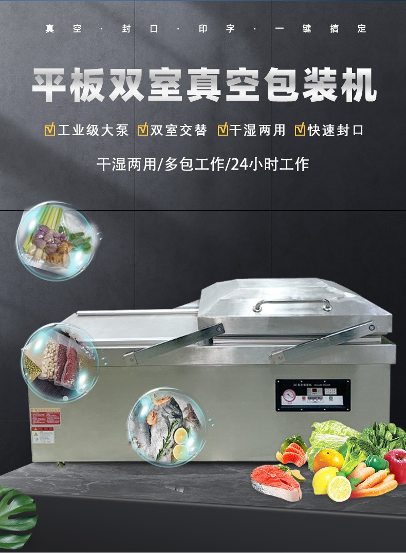 平板雙室真空機是一種常見的真空包裝設備,以下是其相關介紹: 結構特點 真空室:通常由不銹鋼制成,具有兩個對稱的工作室,可同時進行真空包裝操作,提高工作效率。工作室底部為平板狀,便于放置包裝物品,且易于清潔。 密封蓋:采用優質的密封材料,與真空室緊密配合,確保在抽真空過程中保持良好的密封性。密封蓋一般通過鉸鏈或其他機構與真空室相連,可輕松打開和關閉。 真空泵:是真空機的核心部件之一,用于抽取真空室內的空氣,形成真空環境。真空泵的抽氣速度和極限真空度直接影響真空包裝的效果和效率,常見的真空泵有旋片式真空泵、往