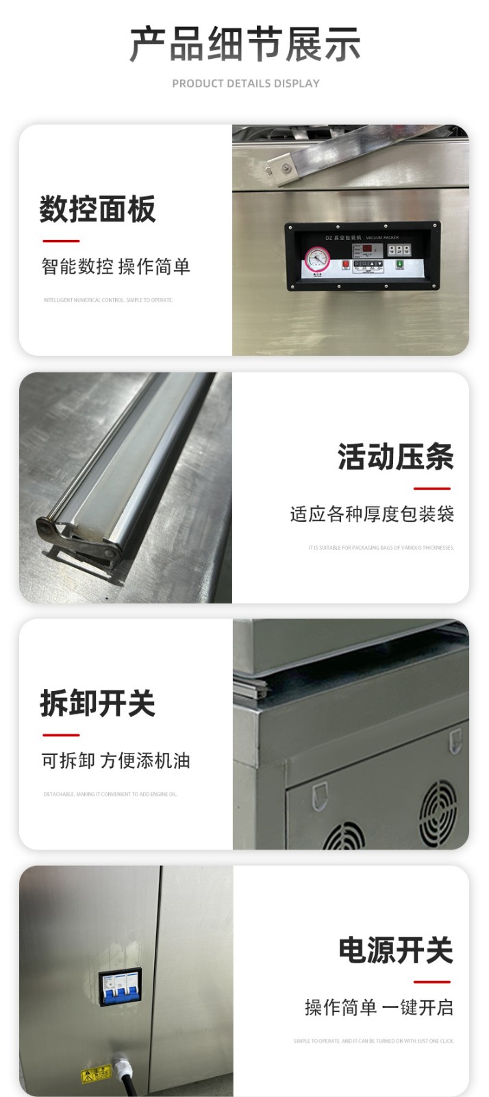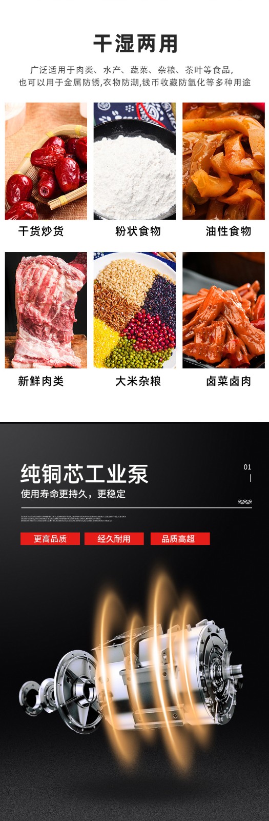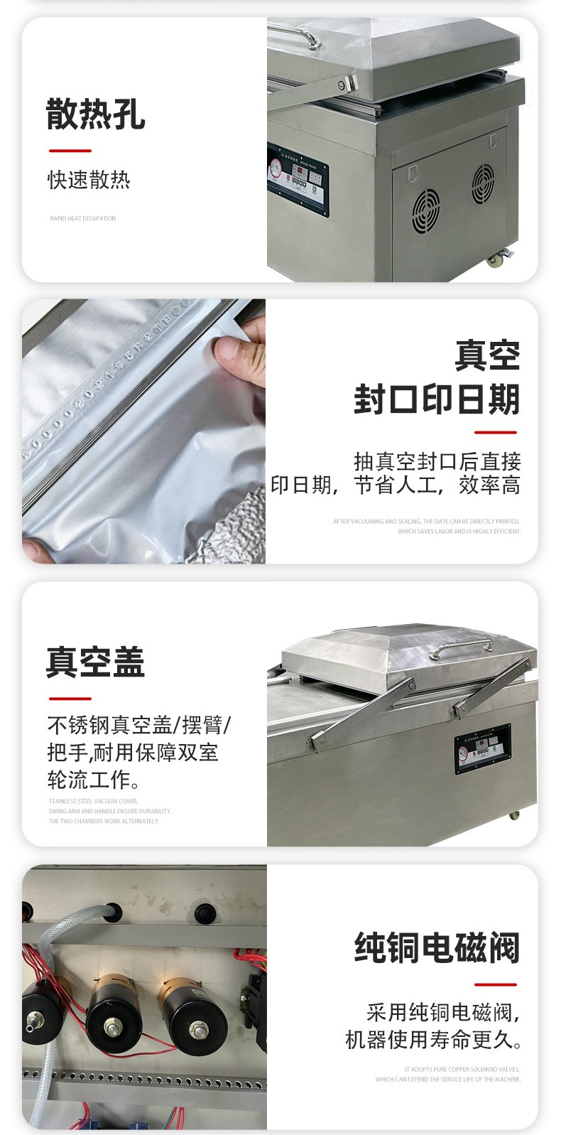 • 優質材質:通常外殼采用 304 不銹鋼制作,強度高、耐腐蝕、不易破損,且符合食品衛生要求。真空室采用高密度材料制作的 V 形密封條,保證了設備的密封性、耐壓性和耐磨性7