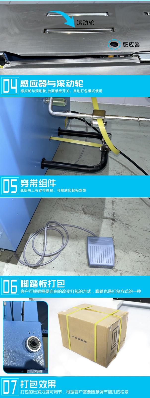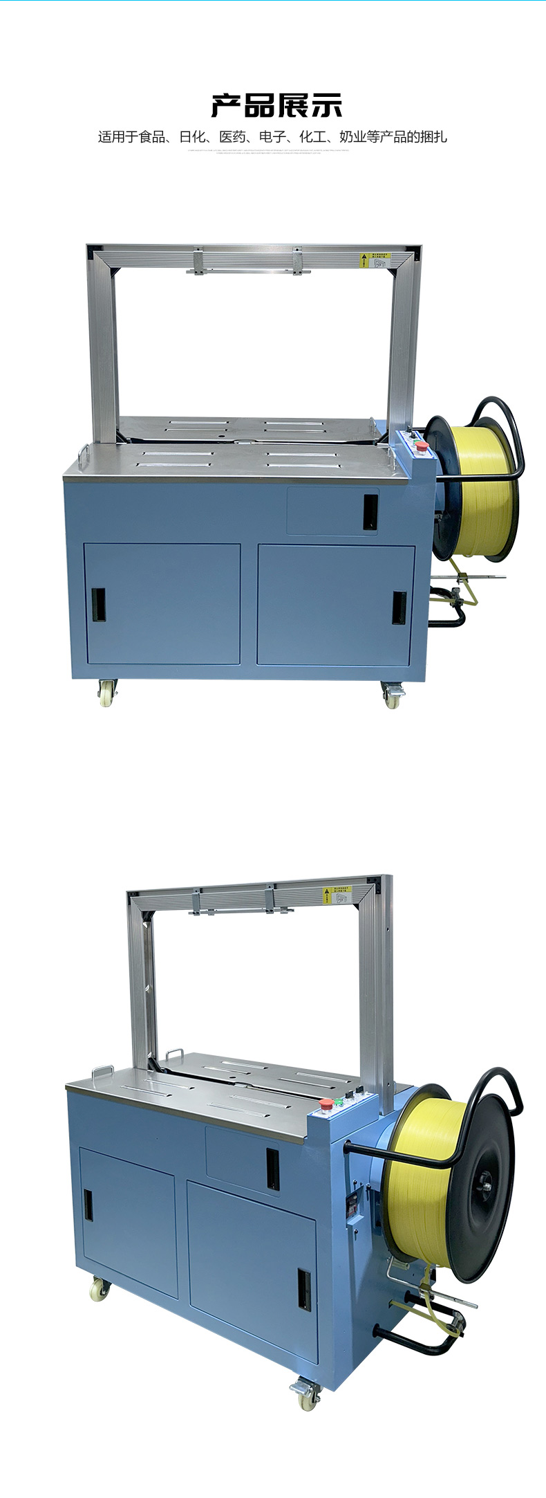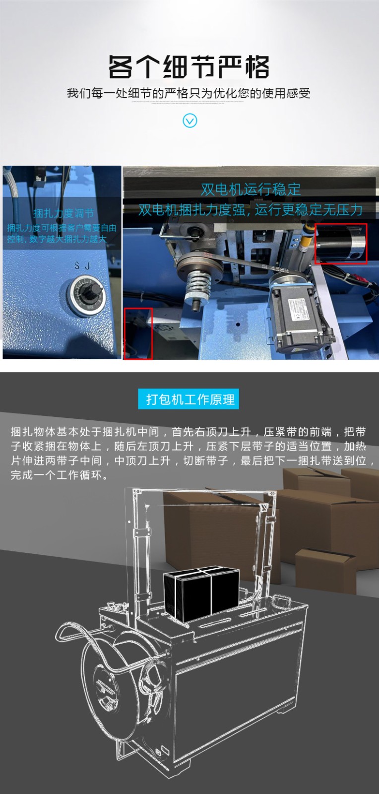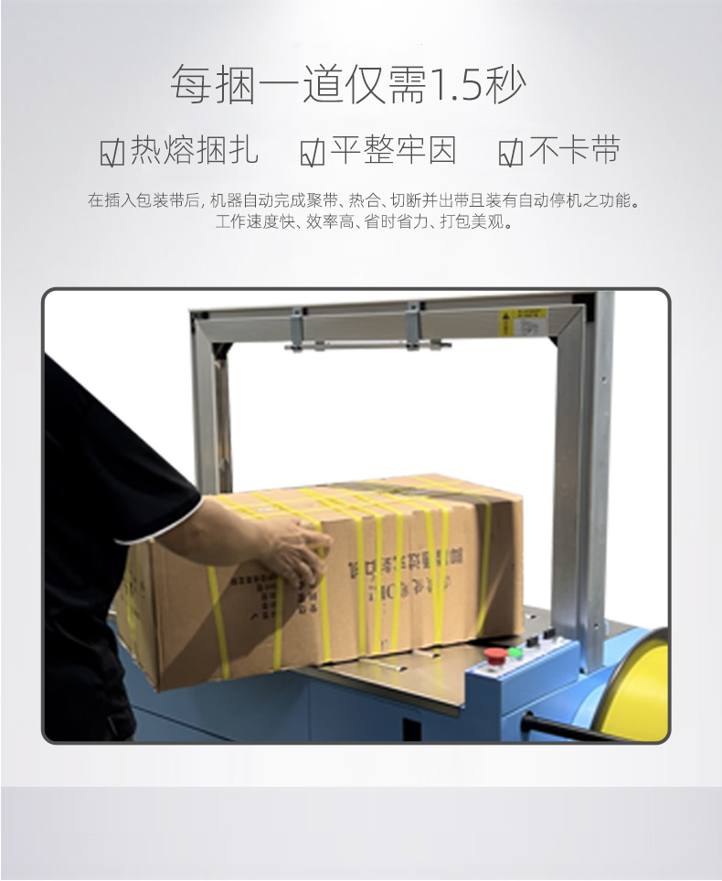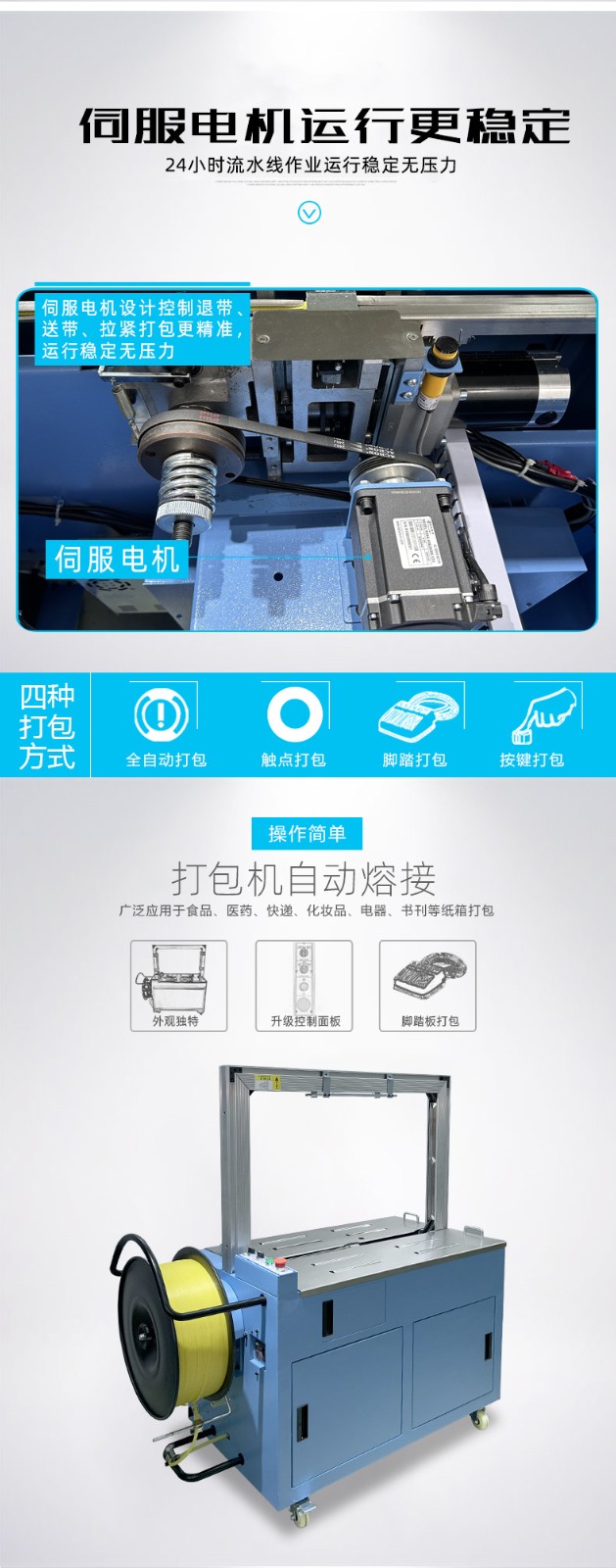 結(jié)構(gòu)組成 伺服電機(jī):作為核心部件,相比傳統(tǒng)電機(jī),它能實(shí)現(xiàn)更高的控制精度和響應(yīng)速度,可在捆扎時(shí)精準(zhǔn)調(diào)整捆扎帶張力,保障捆扎的緊密與均勻。 控制系統(tǒng):負(fù)責(zé)智能化管理整個(gè)捆扎流程。通過傳感器與程序控制,實(shí)時(shí)監(jiān)測并調(diào)整捆扎速度、張力等參數(shù),用戶還能依不同產(chǎn)品需求設(shè)定相應(yīng)捆扎參數(shù),滿足多樣化包裝需求。 捆扎裝置:一般采用熱合或熱熔方式固定捆扎帶。熱合是通過加熱使捆扎帶兩端熔合,形成牢固的捆扎效果,提高捆扎強(qiáng)度,防止運(yùn)輸過程中松脫。 輸送系統(tǒng):負(fù)責(zé)將待捆扎產(chǎn)品送入捆扎機(jī),常與輸送帶或自動(dòng)化生產(chǎn)線等其他生產(chǎn)設(shè)備聯(lián)動(dòng),形