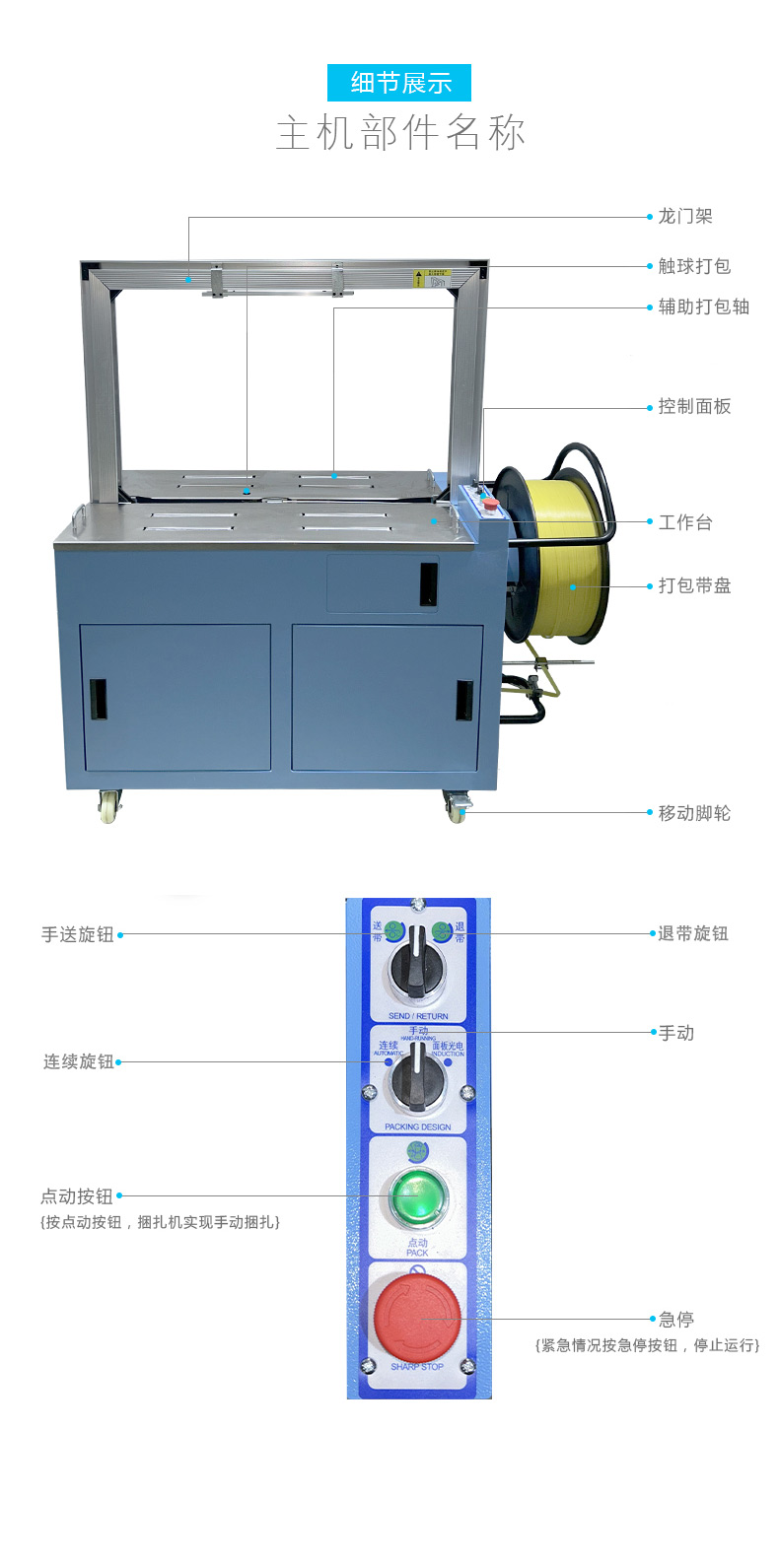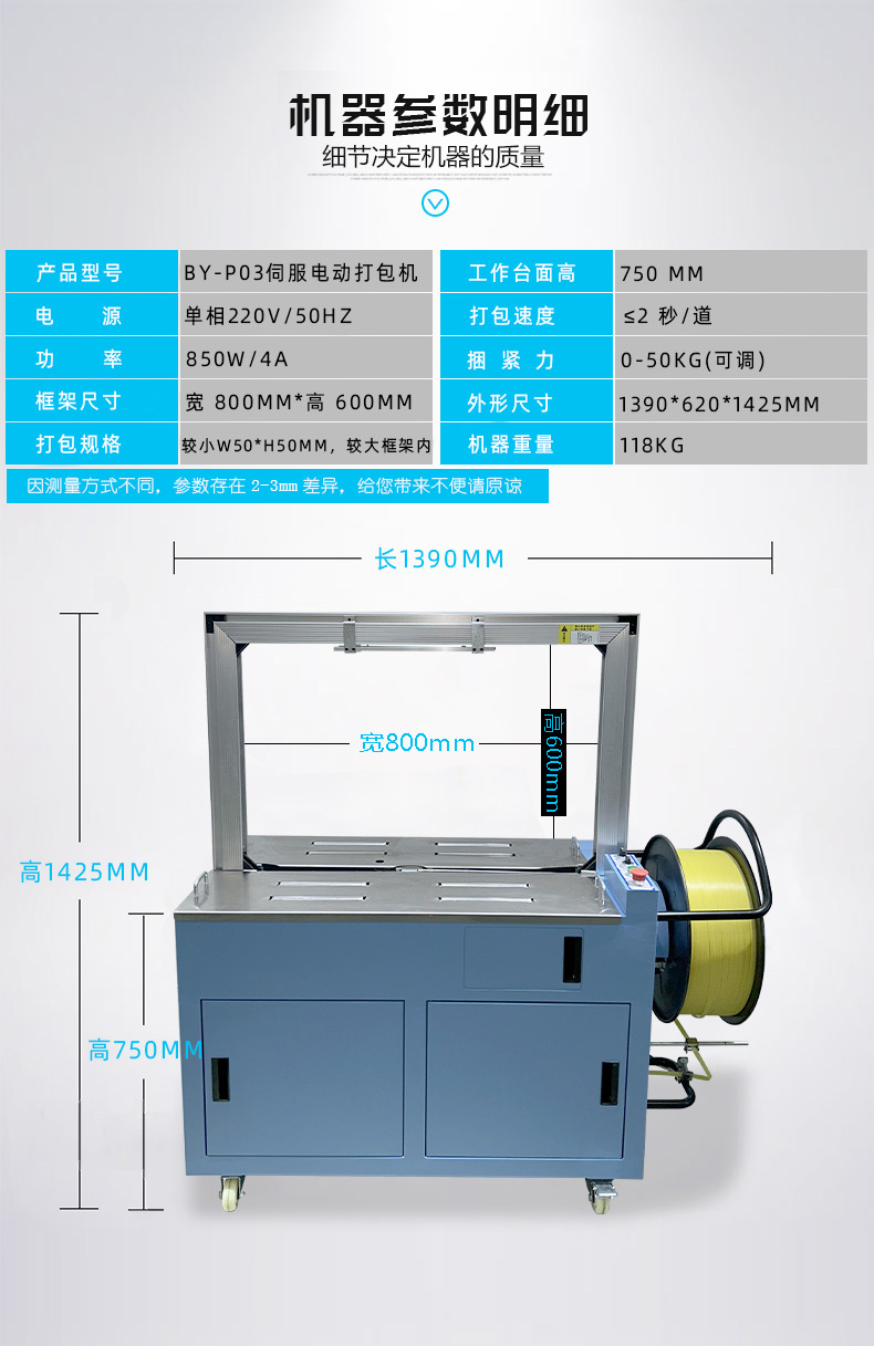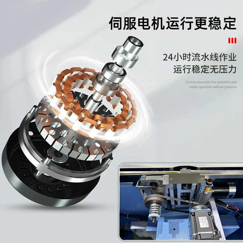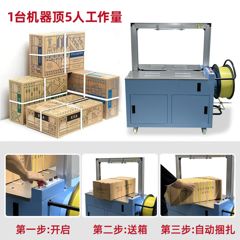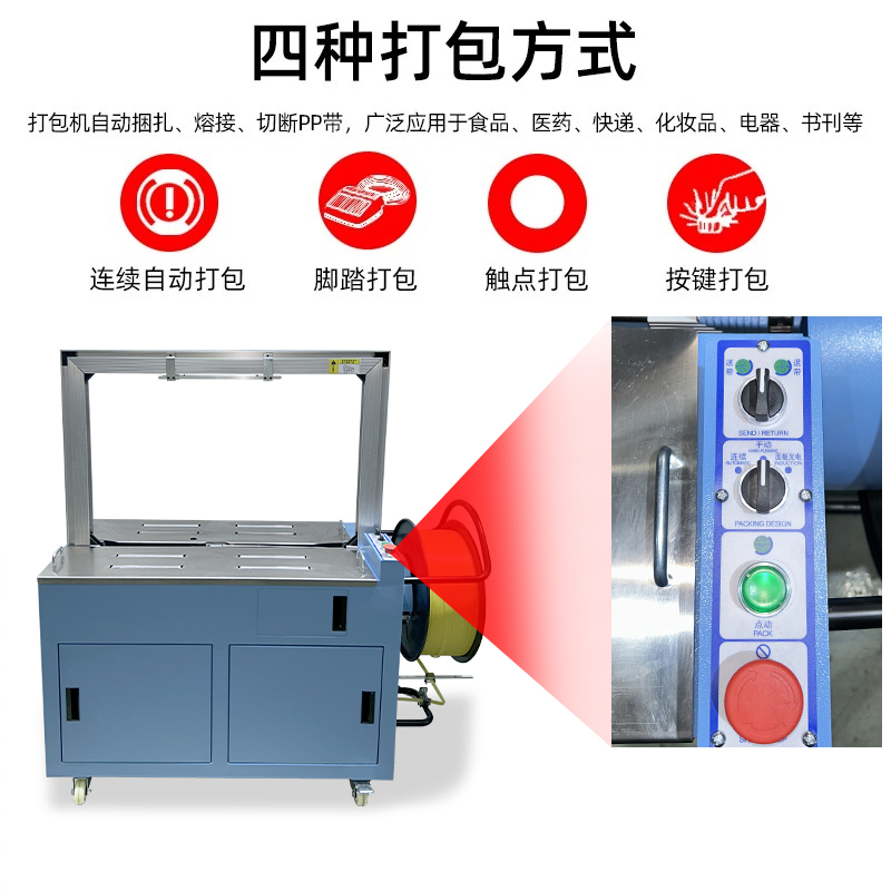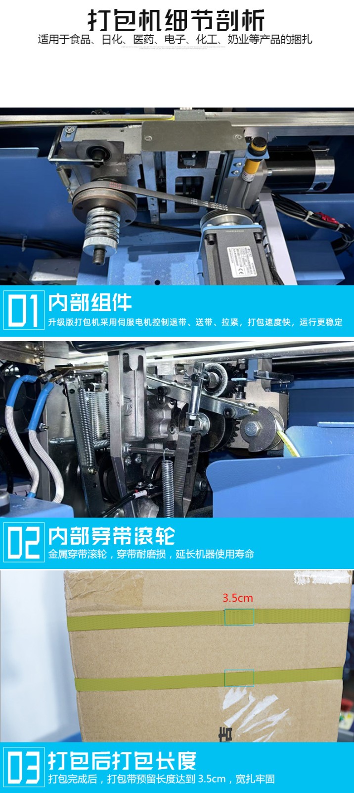 結(jié)構(gòu)組成 伺服電機(jī):作為核心部件,相比傳統(tǒng)電機(jī),它能實(shí)現(xiàn)更高的控制精度和響應(yīng)速度,可在捆扎時(shí)精準(zhǔn)調(diào)整捆扎帶張力,保障捆扎的緊密與均勻。 控制系統(tǒng):負(fù)責(zé)智能化管理整個(gè)捆扎流程。通過傳感器與程序控制,實(shí)時(shí)監(jiān)測并調(diào)整捆扎速度、張力等參數(shù),用戶還能依不同產(chǎn)品需求設(shè)定相應(yīng)捆扎參數(shù),滿足多樣化包裝需求。 捆扎裝置:一般采用熱合或熱熔方式固定捆扎帶。熱合是通過加熱使捆扎帶兩端熔合,形成牢固的捆扎效果,提高捆扎強(qiáng)度,防止運(yùn)輸過程中松脫。 輸送系統(tǒng):負(fù)責(zé)將待捆扎產(chǎn)品送入捆扎機(jī),常與輸送帶或自動(dòng)化生產(chǎn)線等其他生產(chǎn)設(shè)備聯(lián)動(dòng),形