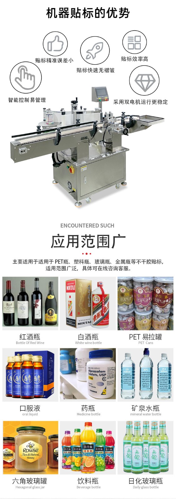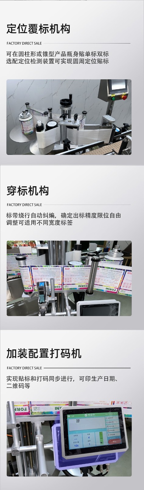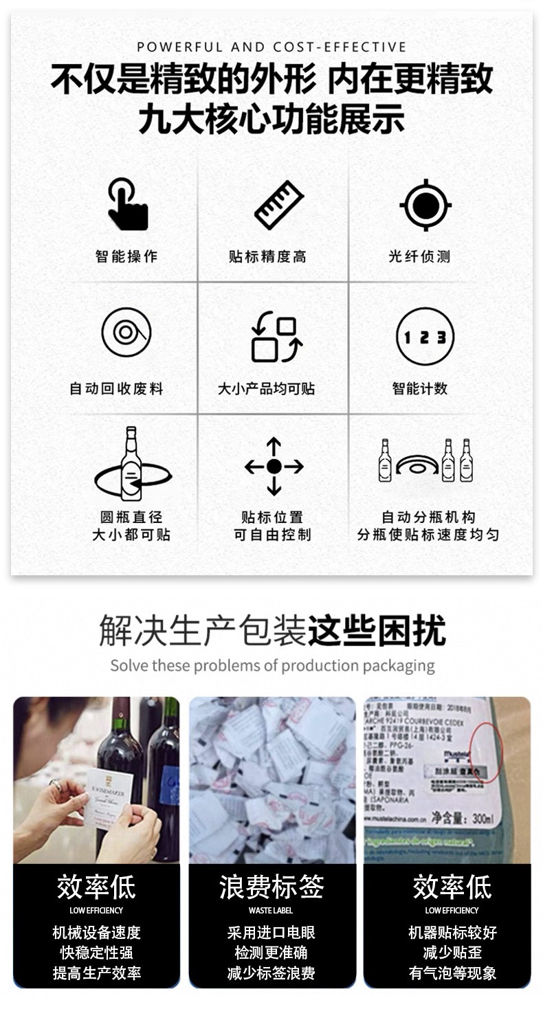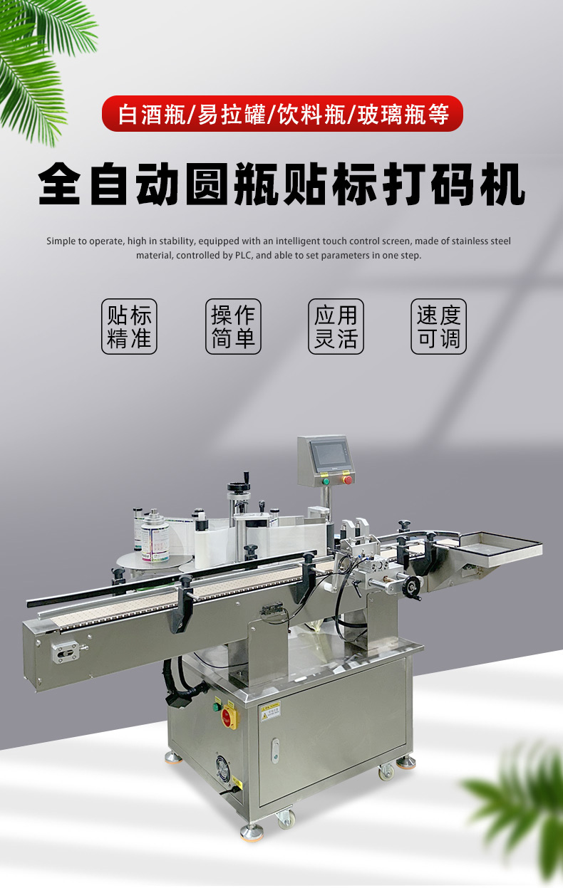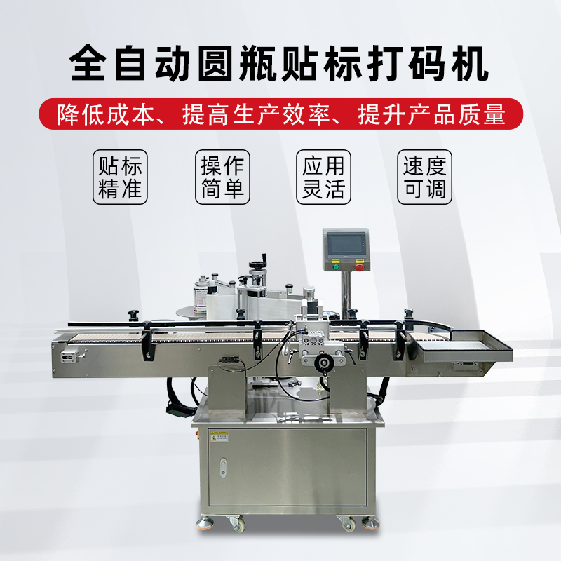 全自動(dòng)圓瓶貼標(biāo)打碼機(jī)是一種集貼標(biāo)和打碼功能于一體的自動(dòng)化設(shè)備,廣泛應(yīng)用于食品、醫(yī)藥、日化等行業(yè)。 以下是其詳細(xì)介紹: 功能特點(diǎn) 貼標(biāo)功能:可在圓瓶的圓周面、圓錐面、雙側(cè)面等位置進(jìn)行貼標(biāo),可貼單標(biāo)或雙標(biāo),正背雙標(biāo)間距可靈活調(diào)整。 打碼功能:可在標(biāo)簽上打印生產(chǎn)日期、批號(hào)、有效期、條形碼、二維碼等信息,滿足不同行業(yè)的標(biāo)識(shí)需求。 自動(dòng)化程度高:采用先進(jìn)的傳感器和控制系統(tǒng),可實(shí)現(xiàn)自動(dòng)送瓶、貼標(biāo)、打碼、收瓶等功能,無(wú)需人工干預(yù),提高生產(chǎn)效率和貼標(biāo)質(zhì)量。 適應(yīng)性強(qiáng):可適應(yīng)不同規(guī)格、形狀的圓瓶,通過(guò)調(diào)整設(shè)備的參數(shù)和更換相