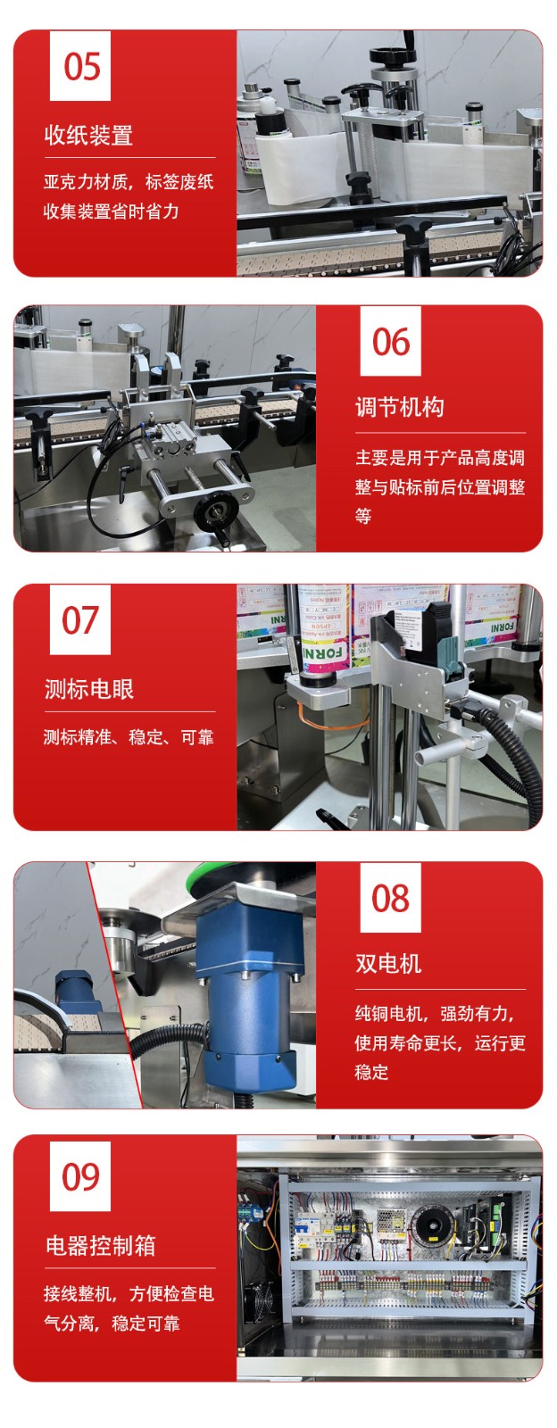 • 貼標(biāo)機(jī)構(gòu):主要包括標(biāo)簽放卷裝置、標(biāo)簽牽引裝置、貼標(biāo)頭和壓標(biāo)裝置等。標(biāo)簽放卷裝置用于放置標(biāo)簽卷,能自動(dòng)放卷并保持標(biāo)簽的張力穩(wěn)定。標(biāo)簽牽引裝置通過(guò)電機(jī)驅(qū)動(dòng),精確控制標(biāo)簽的輸送長(zhǎng)度和速度,使其與圓瓶的輸送速度相匹配。貼標(biāo)頭采用高精度的機(jī)械結(jié)構(gòu)和氣動(dòng)元件,能準(zhǔn)確地將標(biāo)簽貼附在圓瓶表面,并且可以根據(jù)圓瓶的直徑和貼標(biāo)位置進(jìn)行調(diào)整。壓標(biāo)裝置在標(biāo)簽貼附后,對(duì)標(biāo)簽進(jìn)行壓實(shí),確保標(biāo)簽與瓶身緊密貼合,無(wú)氣泡或皺褶。