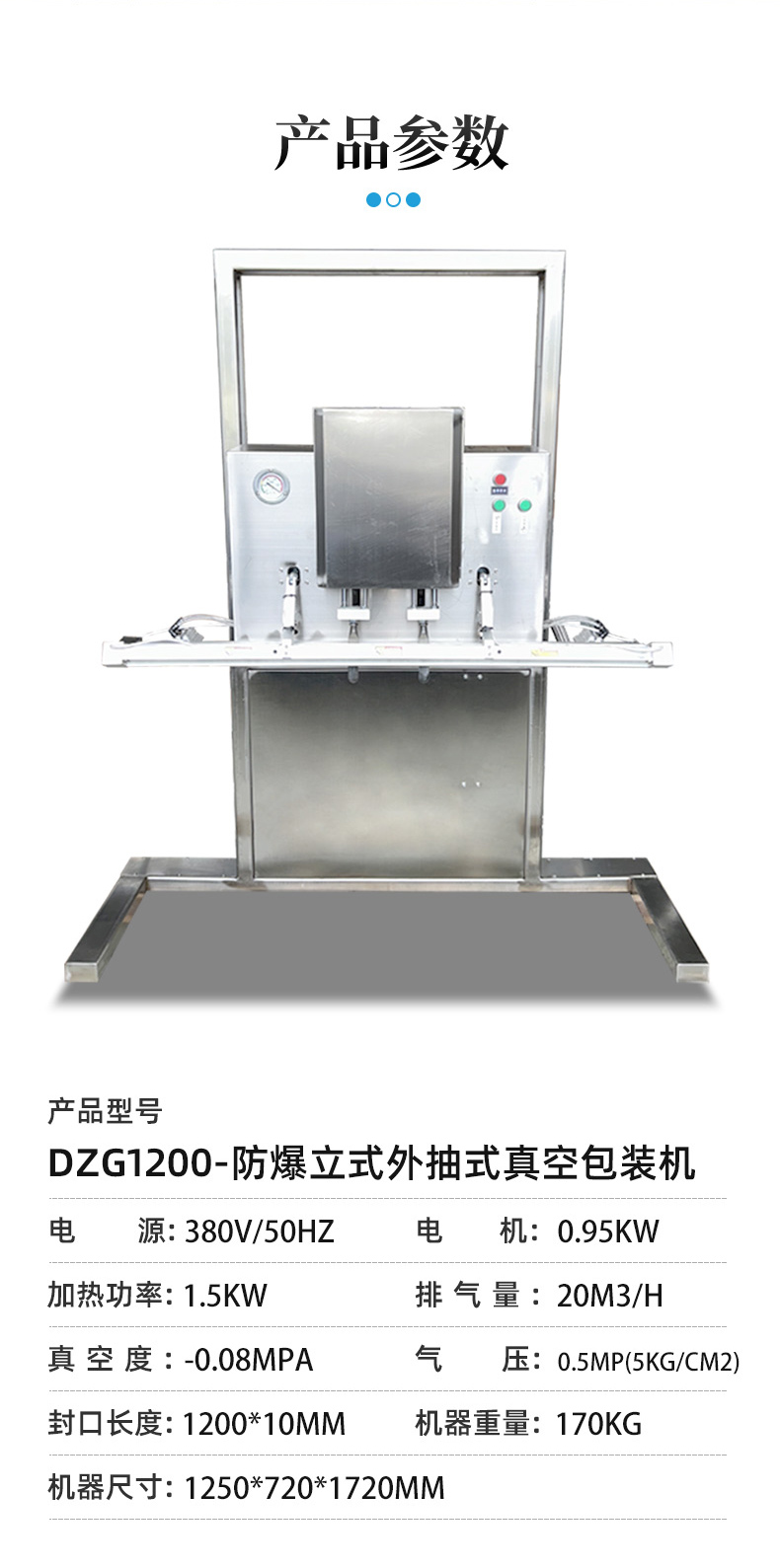 防爆立式外抽真空包裝機是在普通立式外抽真空包裝機的基礎(chǔ)上,采用了防爆技術(shù),使其能夠在存在易燃易爆氣體、粉塵等危險環(huán)境中安全運行的包裝設(shè)備,主要用于化工、醫(yī)藥、制藥、民爆、實驗室、航天航空等領(lǐng)域中易燃易爆物品的包裝封口、儲存。 工作原理 將包裝物裝進復(fù)合塑料真空袋內(nèi),把真空包裝袋的袋口套在機器的抽氣嘴上。 啟動機器后,由上壓塊下壓,壓著袋口封閉,接著真空泵自動啟動抽氣,將包裝袋內(nèi)的空氣抽出,抽至預(yù)設(shè)的真空度。 最后加壓、加熱使包裝袋口封合,完成真空包裝過程。 特點 防爆性能優(yōu)越:采用物理隔離防爆技術(shù),嚴(yán)格選