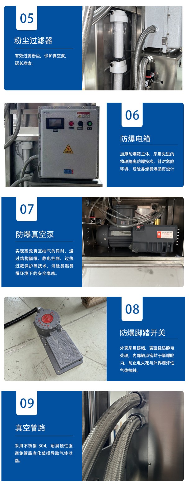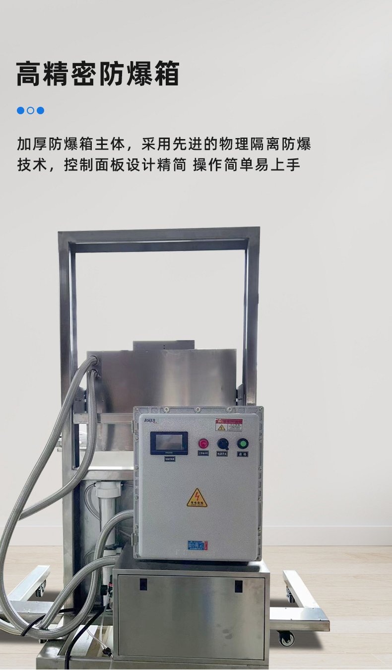• 防爆性能優(yōu)越:采用物理隔離防爆技術(shù),嚴(yán)格選用防爆達標(biāo)元件,電器箱、真空泵、熱封條等都經(jīng)過特殊的防爆處理,能有效防止在操作過程中產(chǎn)生火花,避免爆炸等危險情況的發(fā)生2。