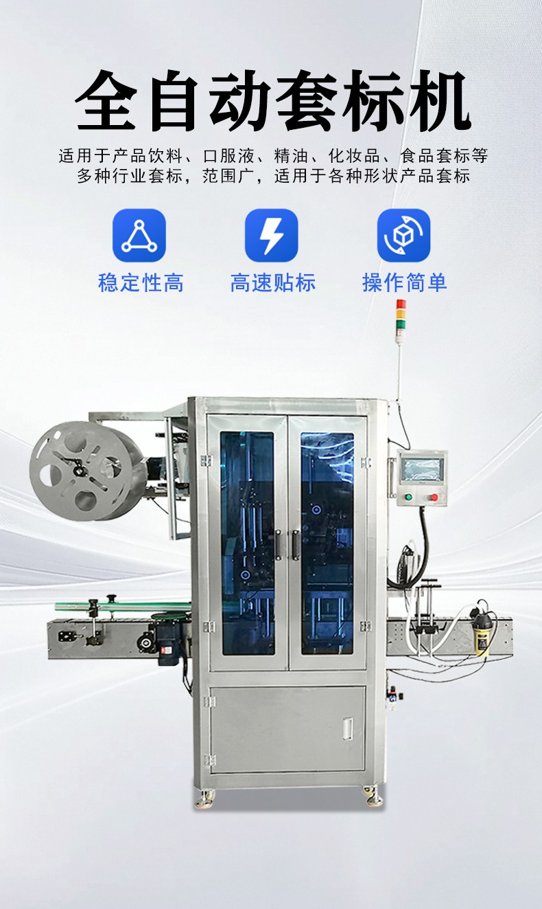 工作原理:全自動套標機通過程式控制系統或電力控制系統實現自動檢測、標簽取放、自動套標等功能。其工作過程一般為,首先容器通過輸送帶系統輸送至套標位置,標簽收卷系統將標簽卷展開,經過送標組將標簽準確地輸送到切刀位置,切刀按照設定的尺寸將標簽切斷,然后通過貼標頭部分將切斷的標簽套在容器上,最后可能還會有熱收縮等后續處理工序,使標簽緊密貼合在容器上。 結構組成 輸送機構:包括輸送帶、帶瓶定位皮帶、分瓶螺桿等,采用變頻器同步器控制各傳動馬達,可通過調整一個旋鈕來輕松調整整機運行速度,確保容器穩定、準確地輸送到套標位