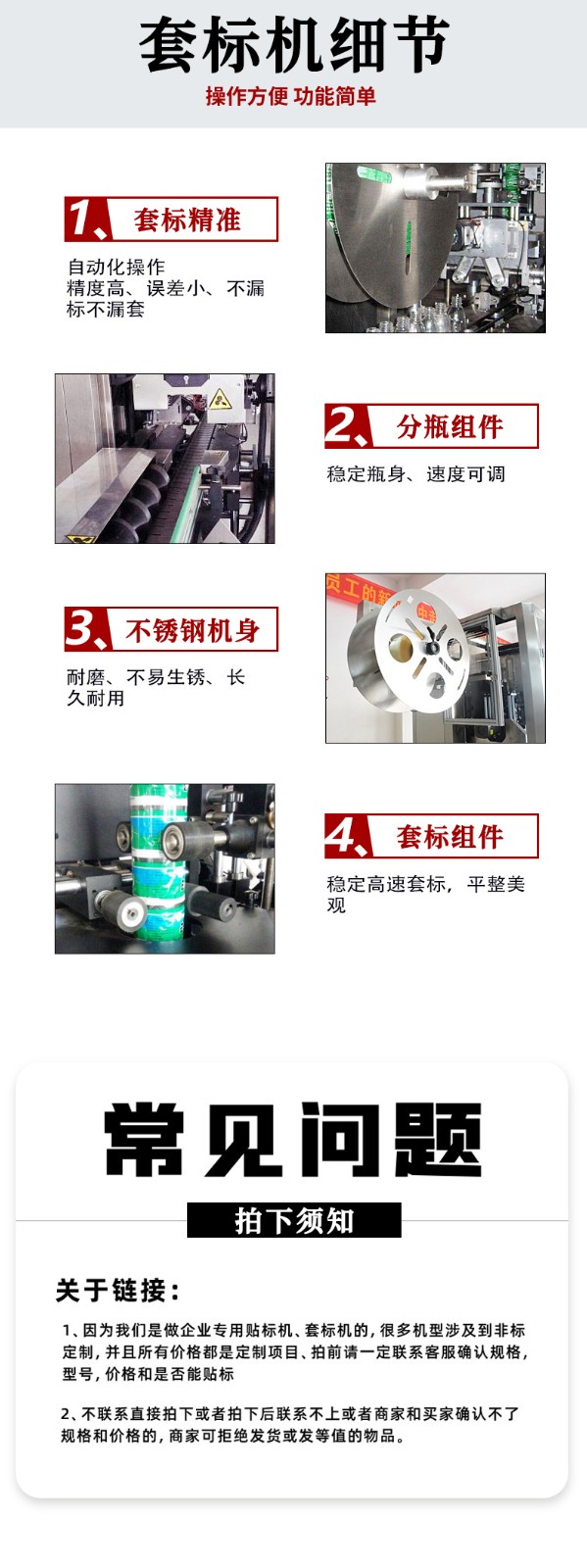 • 撥輪機構通過伺服電機驅動,將容器調整為等間距(誤差≤1mm)、同方向排列,確保每個容器的套標位置(如瓶頸、瓶身中部)與標簽開口完全對應。