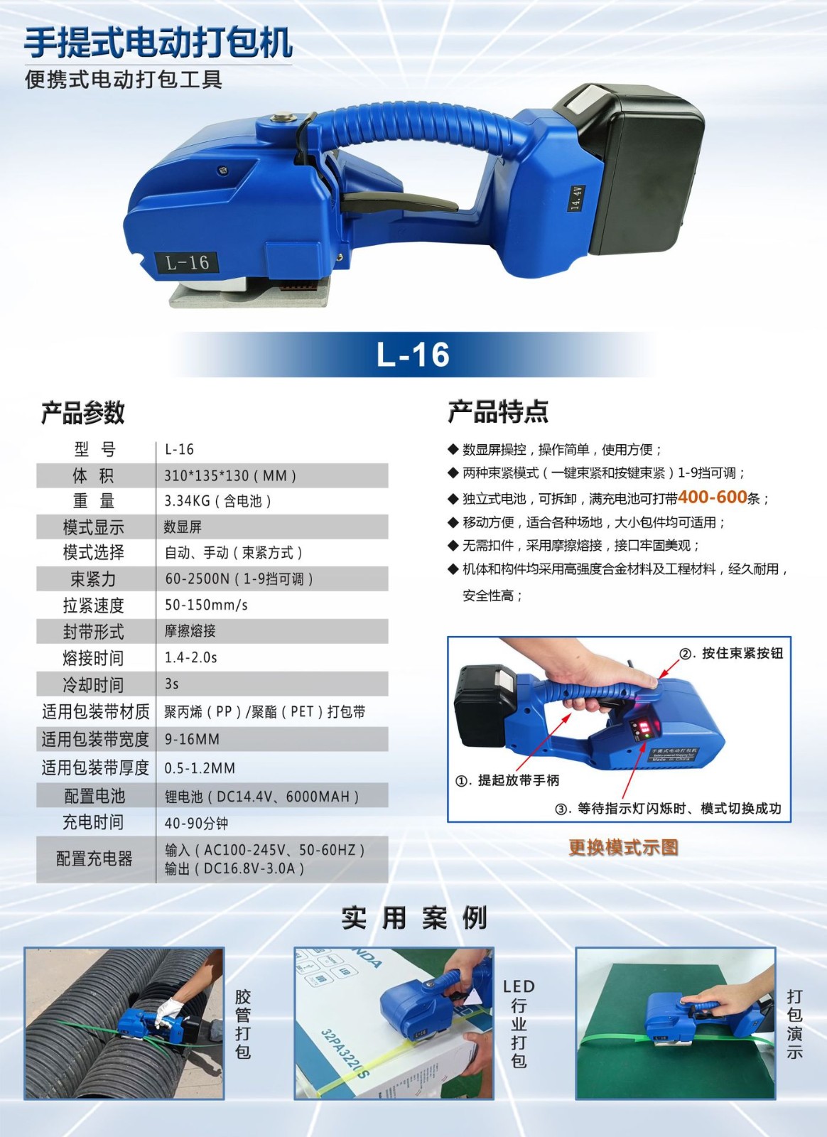 L-16手提式電動打包機PET帶PP帶全自動免扣熱熔捆扎打包機