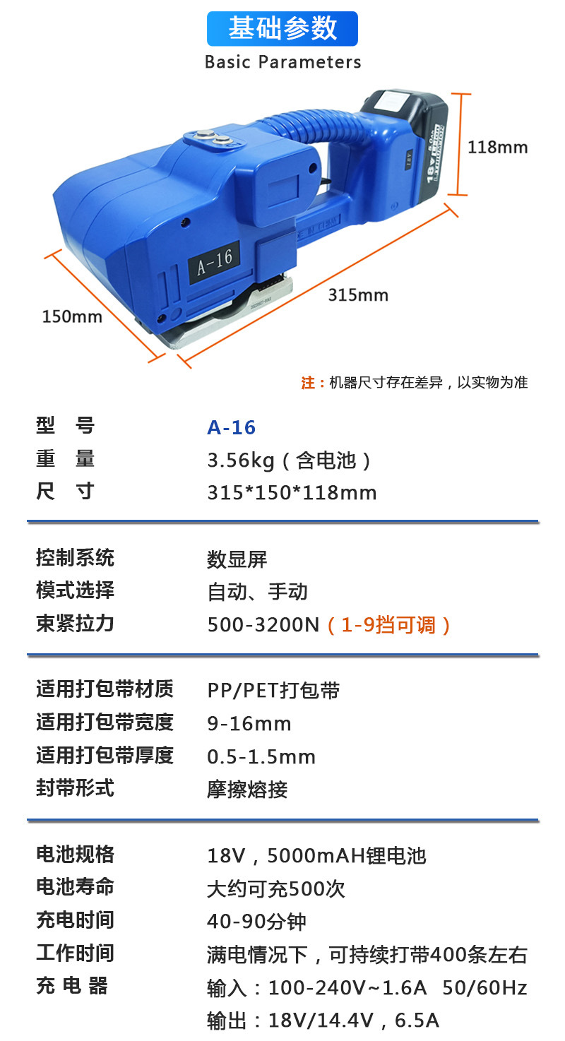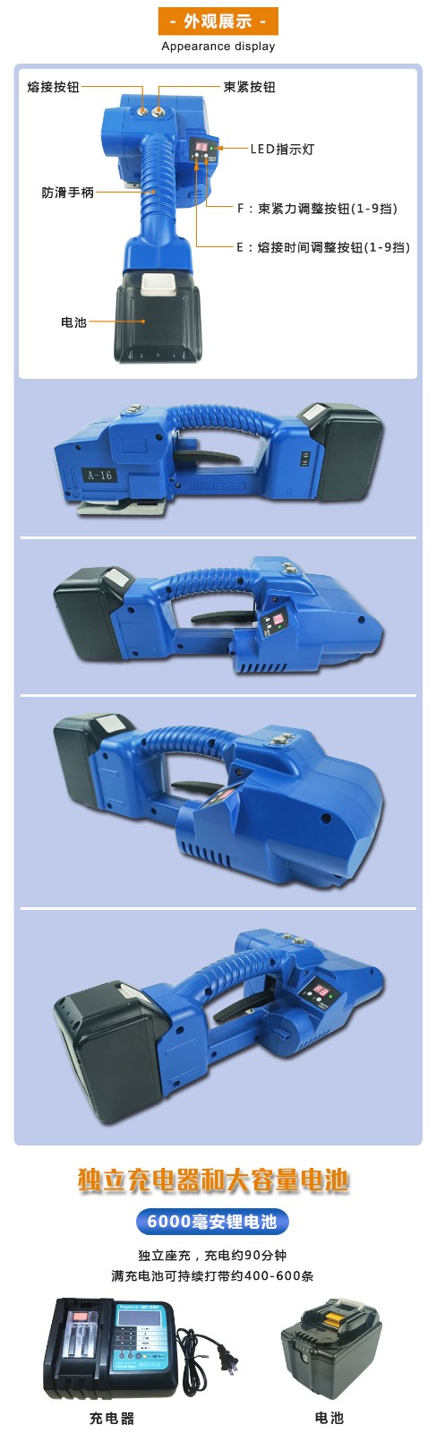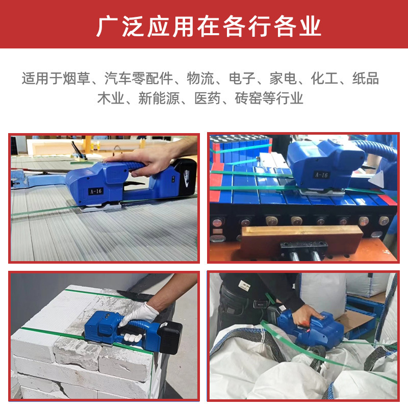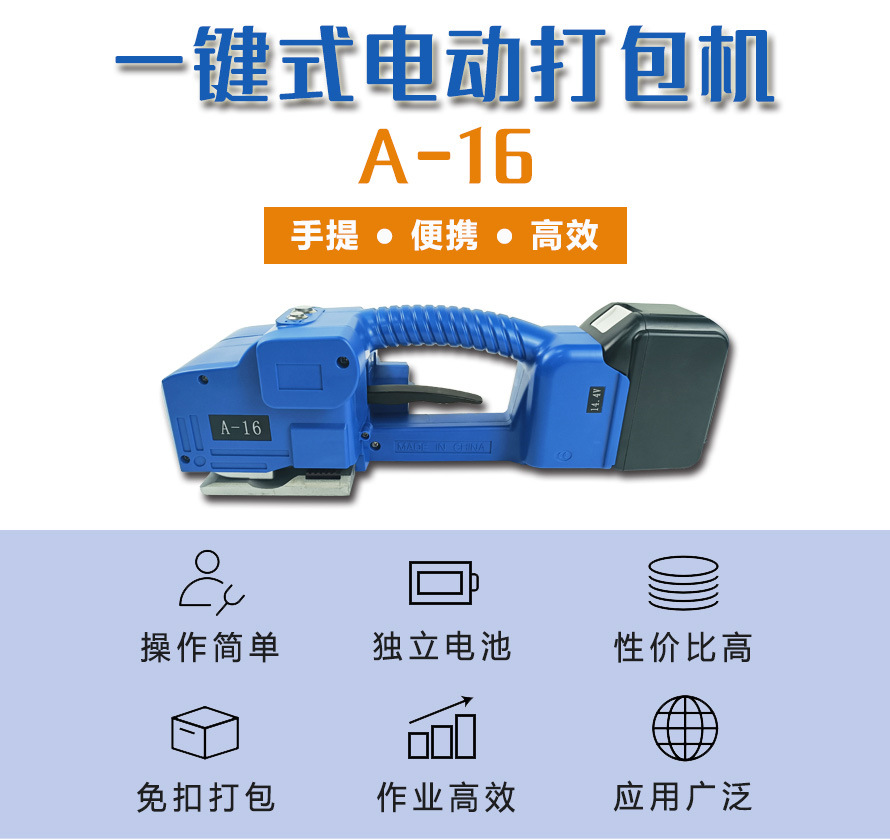 一鍵式電動(dòng)打包機(jī)A-16手提式打包機(jī)適用范圍廣:如木材、鋼材、鋁材、家具、陶瓷、石材等產(chǎn)品打包。 ●隨意移動(dòng):隨意移動(dòng)性較好,使用方便