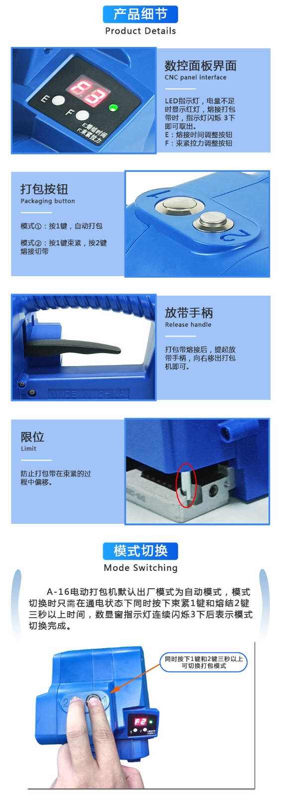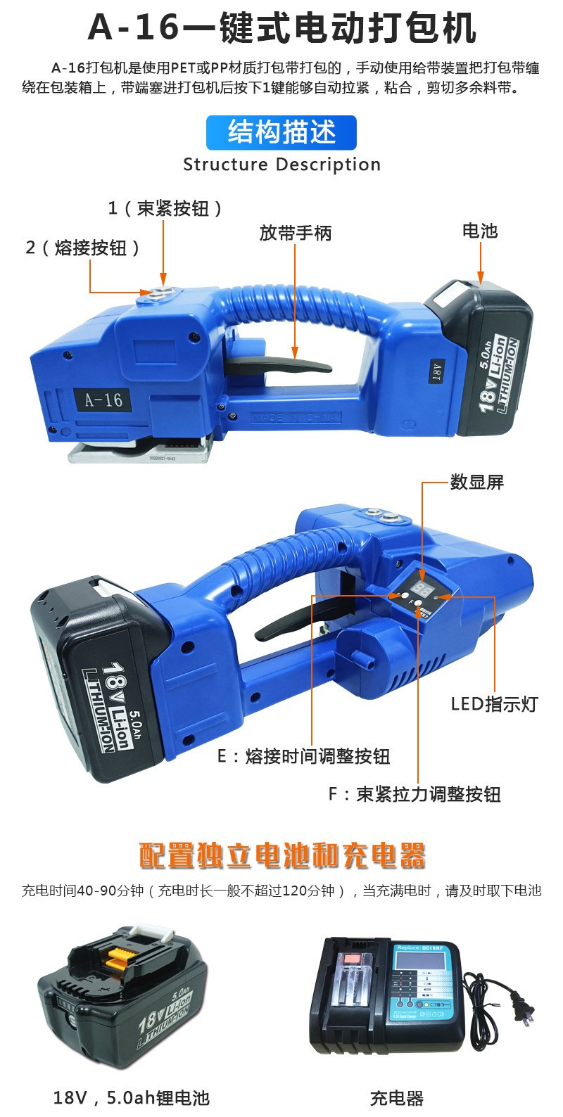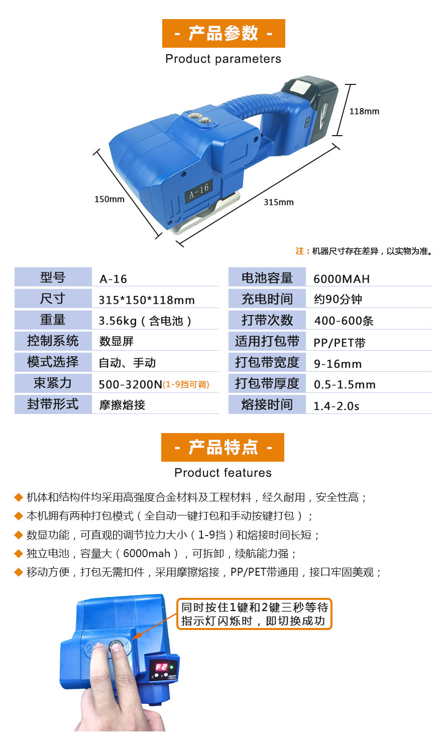 一鍵式電動(dòng)打包機(jī)A-16手提式打包機(jī)適用范圍廣:如木材、鋼材、鋁材、家具、陶瓷、石材等產(chǎn)品打包。 ●隨意移動(dòng):隨意移動(dòng)性較好,使用方便