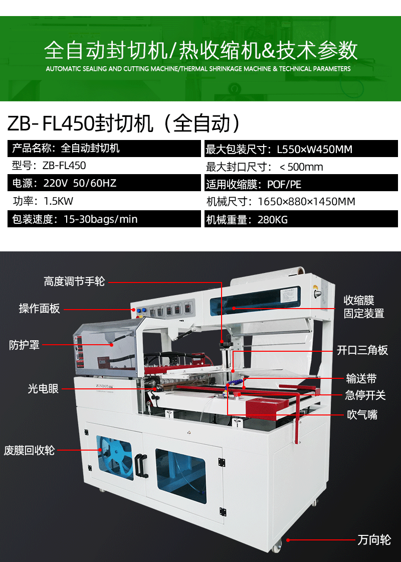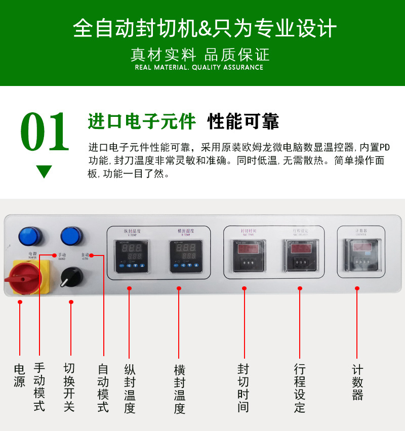 封切機是全自動無人化操作的包裝機,廣泛用于批量生產(chǎn)包裝的流水作業(yè),工作效率高,自動送膜打孔,自動套膜封切,自動卷取廢料;只需手動調(diào)節(jié)導(dǎo)膜系統(tǒng)以及手動調(diào)節(jié)進料輸送平臺,適用不同寬度及高度的產(chǎn)品。